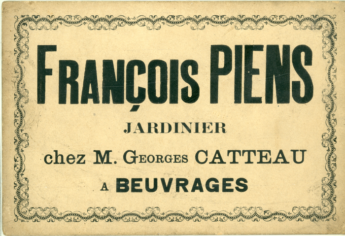 Visitekaartje van bloemist François Piens, toen hij meesterknecht was bij de heer Catteau in het Noord-Franse Beuvrages. Na zijn werk daar stichtte hij begin 1900 een eigen bloemisterij in Destelbergen waar nu nog steeds bloemisterij Piens bestaat.