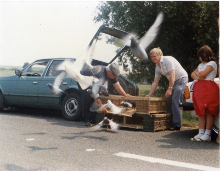 André Roegiers en André De Temmerman van 'Vriendenkring Duivenliefhebbers Landskouter' lieten de duiven vliegen. Deze vriendenkring werd opgericht in 1982 en organiseerde jaarlijks een duivenvlucht tijdens de kermis. De duiven vertrokken uit Rebecq. Enkel duivenliefhebbers uit Landskouter mochten deelnemen aan de wedstrijd.