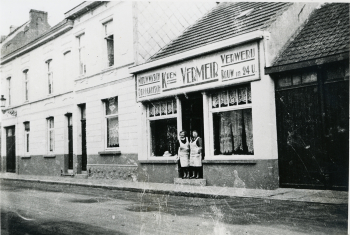 Medewerkers van de wasserij 'Vermeir' voor de wasserij in de Sint-Jozefstraat te Merelbeke.