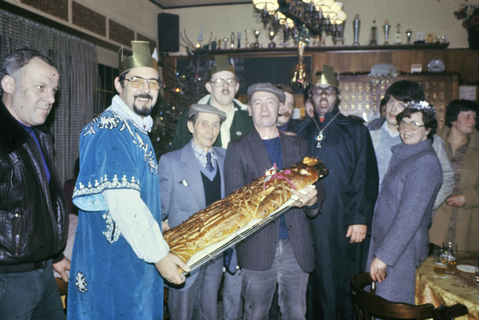 V.l.n.r. Gilbert Van Lancker, koning Napoleon Staelens, kleine man: onbekend, koning Ronny Eeckhout, Edmond Fiers, man erachter met snor Eric Versnaeyen, zwarte koning Eric Leytens en Dirk Versnaeyen. De vrouw is Marietje (familienaam?) en helemaal achteraan staat Rita Van de Velde.