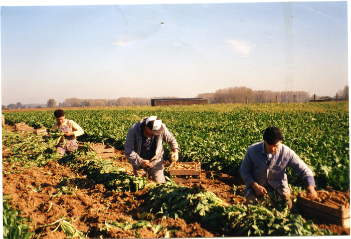 Familie Van De Slijke oogst de witloofwortels op het veld. De wortels zelf worden verzameld in houten kisten. Het loof wordt van de wortels afgesneden.