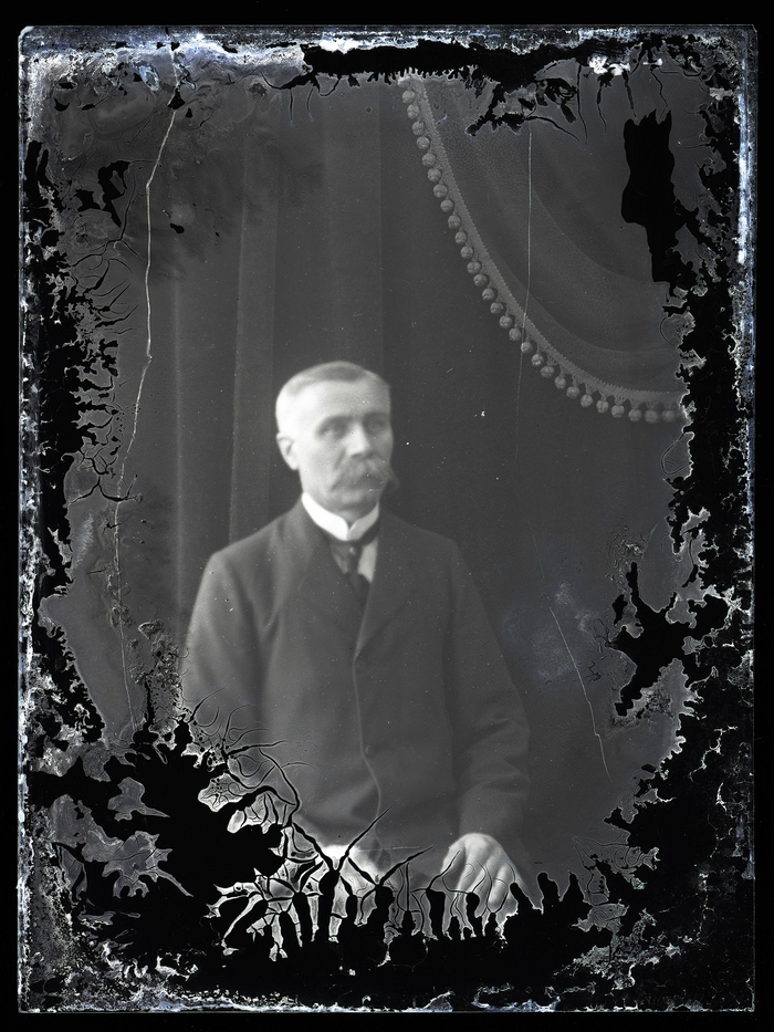 Studiofoto, zittend portret van man in feestkledij met wit hemd en stropdas, gemodelleerde snor en glad naar rechts gekamd haar, Melle, 1910-1920